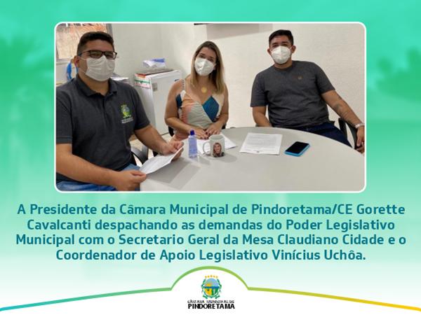 A Presidente da Câmara Municipal de Pindoretama/CE Gorette Cavalcanti despachando as demandas do Legislativo Municipal Posted on 24 de fevereiro, 2022 | by Gustavo Oliveira | Leave a Comment on A Presidente da Câmara Municipal de Pindoretama/CE Gorette Cavalcanti despachando as demandas do Legislativo Municipal Com o Secretario Geral da Mesa Claudiano Cidade e o Coordenador de Apoio Legislativo Vinícius Uchôa.