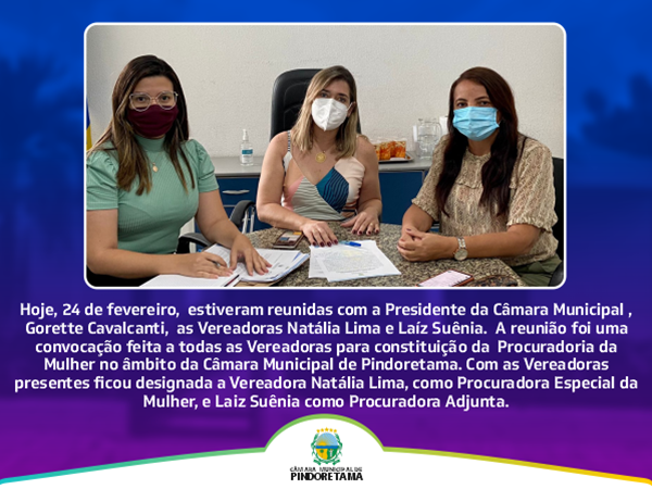 Constituição da Procuradoria da Mulher no âmbito da Câmara Municipal de Pindoretama Posted on 24 de fevereiro, 2022 | by Gustavo Oliveira | Leave a Comment on Constituição da Procuradoria da Mulher no âmbito da Câmara Municipal de Pindoretama Estiveram reunidas com a Presidente da Câmara Municipal , Gorette Cavalcanti, as Vereadoras Natália Lima e Laíz Suênia.