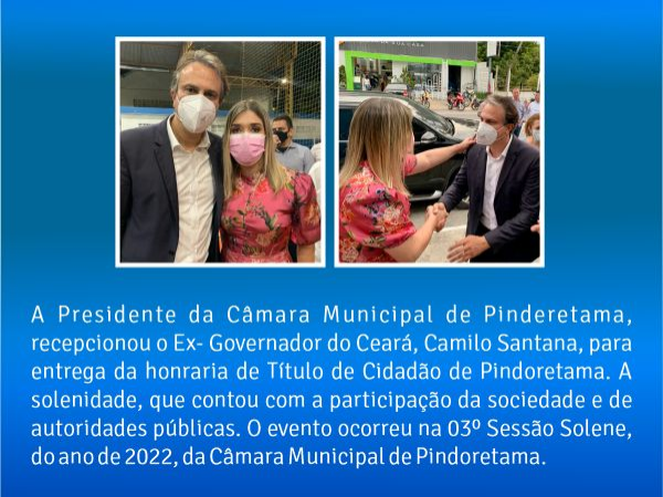 A Presidente da Câmara Municipal de Pindoretama Vereadora Gorette Cavalcanti recepcionou o ex-governador Camilo Santana. Posted on 26 de junho, 2022 | by Gabriel Martins | Leave a Comment on A Presidente da Câmara Municipal de Pindoretama Vereadora Gorette Cavalcanti recepcionou o ex-governador Camilo Santana. Recepcionado pela Vereadora Gorette Cavalcanti e demais partamentares o ex-governador Camilo Santana recebeu o Título de Cidadão Pindoretamense.