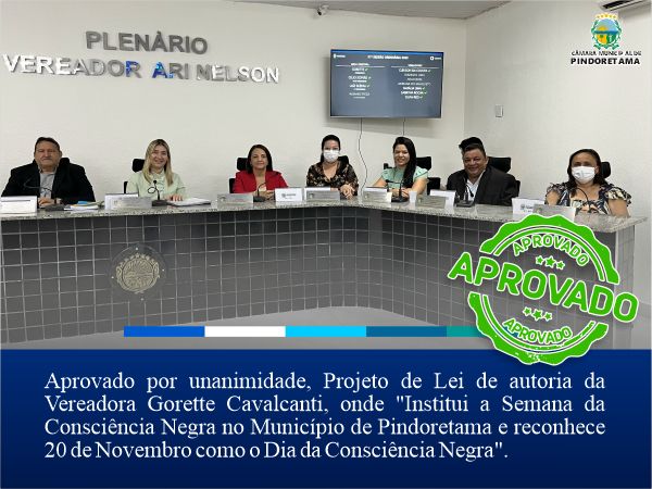 Aprovado a Semana Municipal da Consciência Negra. Posted on 22 de novembro, 2022 | by Gabriel Martins | Leave a Comment on Aprovado a Semana Municipal da Consciência Negra. De autoria da Vereadora Gorette Cavalcanti o Projeto prevê que seja instituído a Semana da Consciência Negra no Município e reconhece 20 de Novembro como o Dia da Consciência Negra.