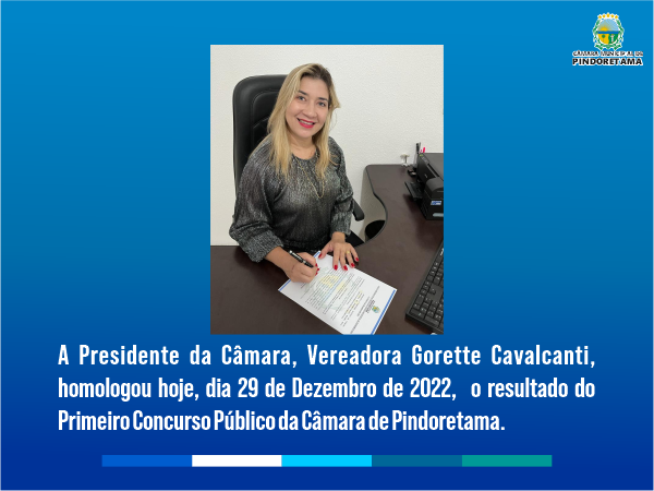 A PRESIDENTE DA MESA DA CÂMARA MUNICIPAL DE PINDORETAMA, Exma. Senhora Vereadora Maria Gorette Cavalcanti Bastos Sobrinha no uso de suas atribuições legais, após apreciação do resultado final do Concurso Publico de Provas, para Provimento de Cargos Efetivos da Câmara Municipal de Pindoretama/Ce, realizado em conformidade com as legislações municipais em vigor, bem como o Edital nº 01/2022 executado pelo INSTITUTO CONSULPAM – Consultoria Público-Privada, HOMOLOGA o RESULTADO DEFINITIVO / FINAL do CONCURSO PÚBLICO – EDITAL 01/2022, com o respectivo Relatório Geral por Ordem de Cargo e Classificação, para fins de direito e consequências de lei.