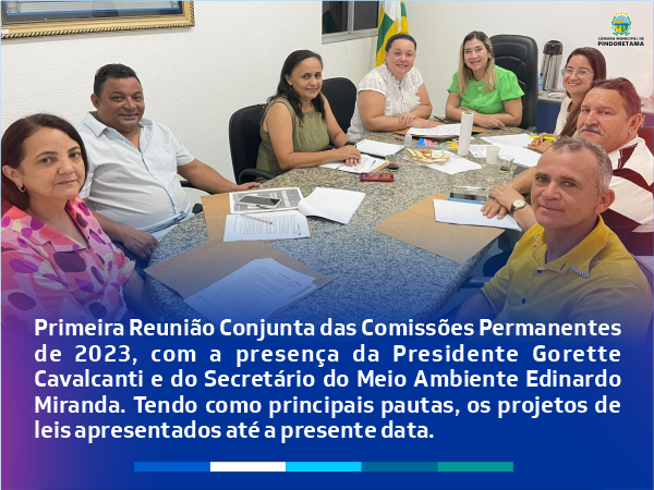 PRIMEIRA REUNIÃO CONJUNTA DAS COMISSÕES PERMANENTES DE 2023 Posted on 2 de março, 2023 | by Gabriel Martins | Leave a Comment on PRIMEIRA REUNIÃO CONJUNTA DAS COMISSÕES PERMANENTES DE 2023 Tendo como principais pautas os projetos de leis apresentados até a presente data.