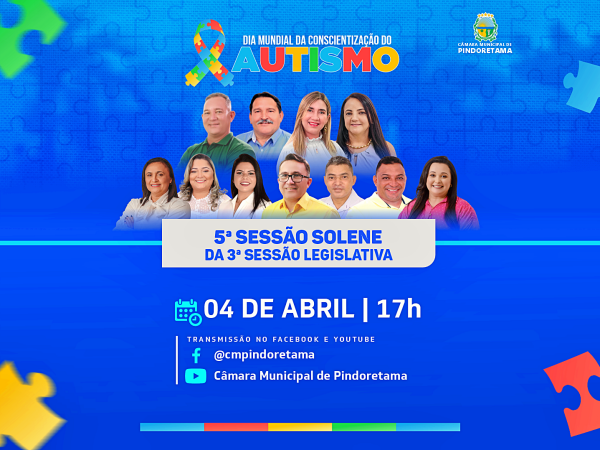 SESSÃO SOLENE SEMANA MUNICIPAL DO AUTISMO 2023 Posted on 3 de abril, 2023 | by Gabriel Martins | Leave a Comment on SESSÃO SOLENE SEMANA MUNICIPAL DO AUTISMO 2023 SESSÃO SOLENE SEMANA MUNICIPAL DO AUTISMO 2023
